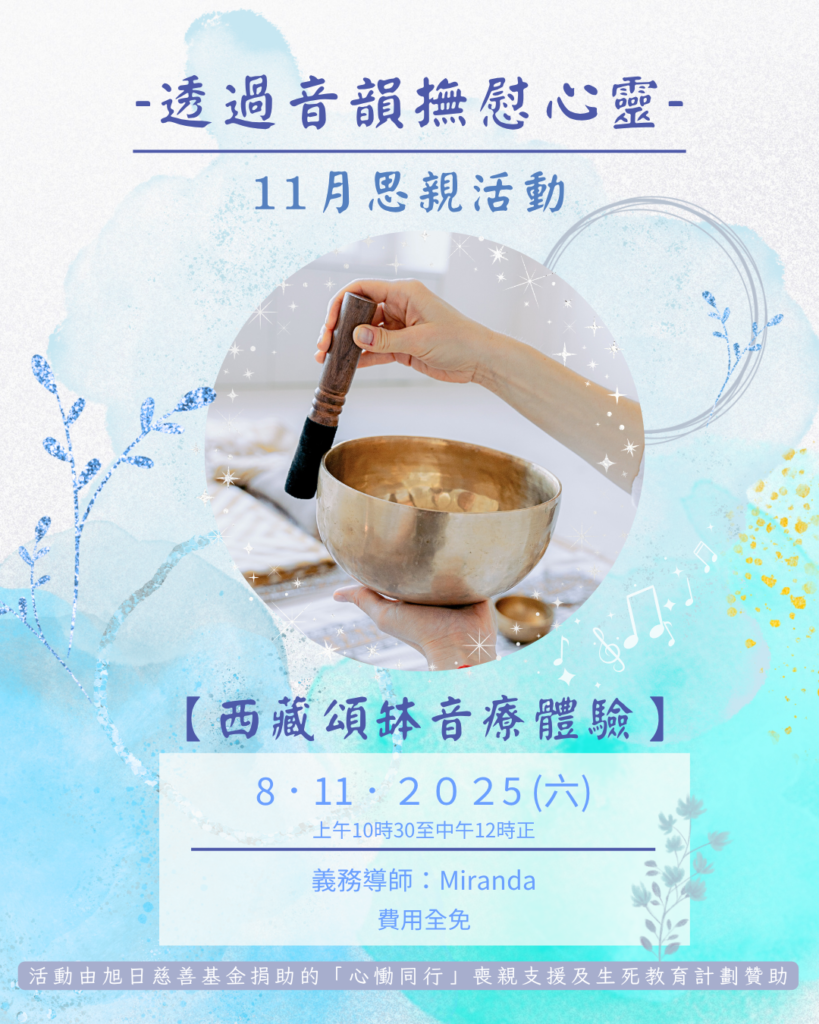 – 透過義務導師的帶領,認識及體驗頌缽的音韻和療癒,並提供一個空間表達對親人的思念,找回內心的平靜。