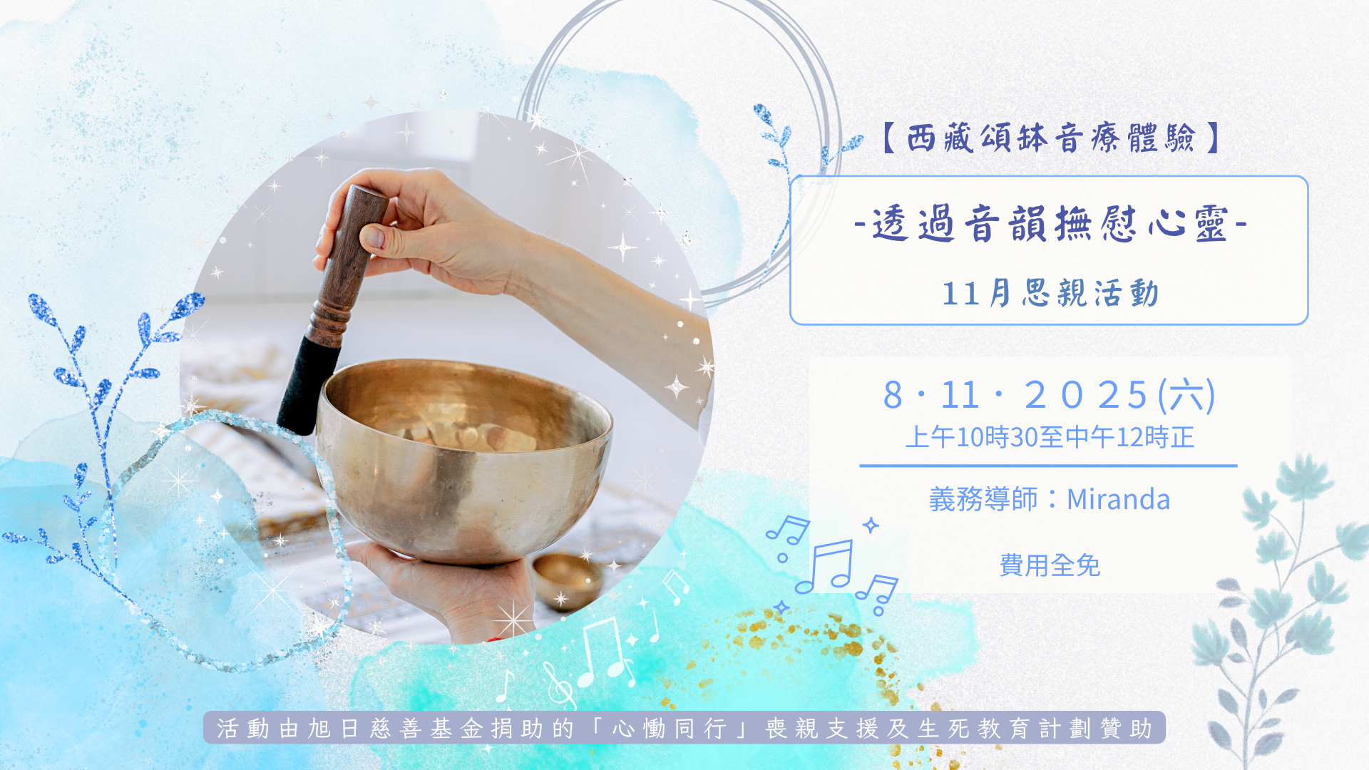 – 透過義務導師的帶領,認識及體驗頌缽的音韻和療癒,並提供一個空間表達對親人的思念,找回內心的平靜。