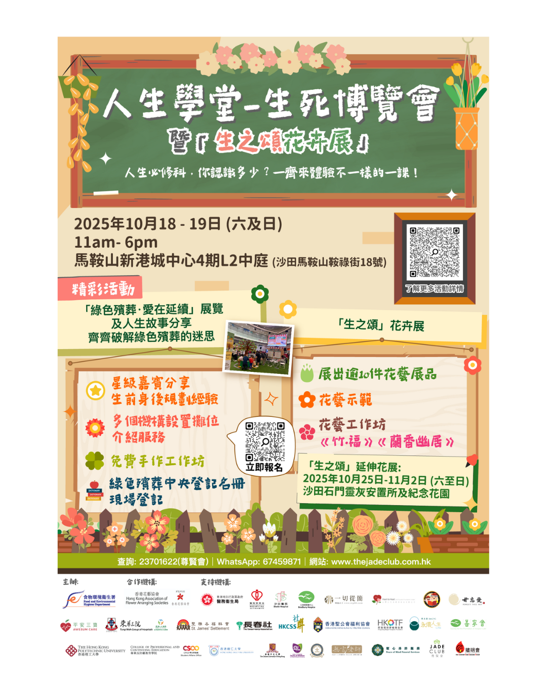 東華三院「圓滿人生服務」及賽馬會安寧頌「安寧在院舍」計劃(新界東)將於2025年10月18日參與由食物環境衞生署舉辦的「人生學堂」生死博覽會暨「生之頌花卉展」,當日將會設有互動攤位,介紹「終.有得揀」預設照顧計劃以及東華三院與晚期照顧、生死教育及安老院「居處離世」相關的服務。