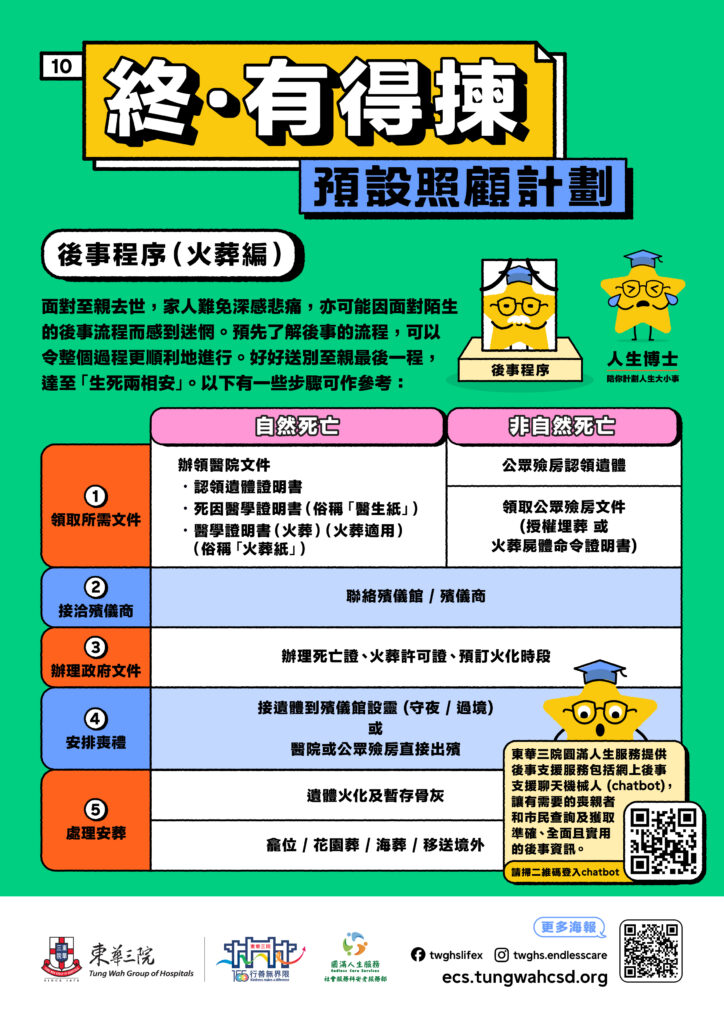 閱讀資訊後如有疑問,歡迎登入網上表格【知多啲啲 你問我答】,填妥簡單的電子表格,「圓滿人生服務」將會透過電郵/簡單 WhatsApp 回答閣下有關預設照顧計劃 (ACP) 或居處離世的疑問。如欲持續訂閱【終.有得揀】預設照顧計劃電子海報,請按此。
