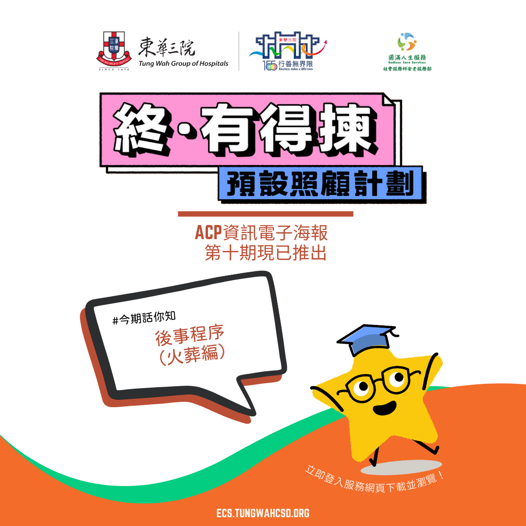 為增加大家對「預設照顧計劃」(Advance Care Planning)的認識,計劃將會定時每月發放提供一系列「預設照顧計劃」電子海報,讓大家獲取與晚期照顧安排相關的資訊,並鼓勵大家將資訊與相關人士分享。