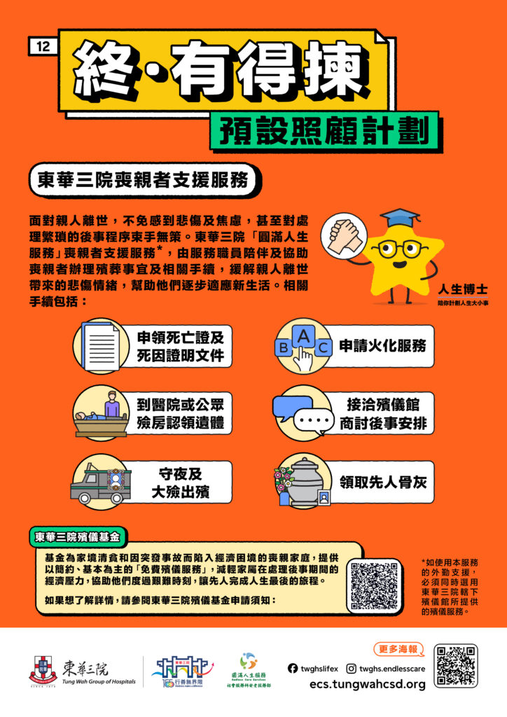 閱讀資訊後如有疑問,歡迎登入網上表格【知多啲啲 你問我答】,填妥簡單的電子表格,「圓滿人生服務」將會透過電郵/簡單 WhatsApp 回答閣下有關預設照顧計劃 (ACP) 或居處離世的疑問。如欲持續訂閱【終.有得揀】預設照顧計劃電子海報,請按此。