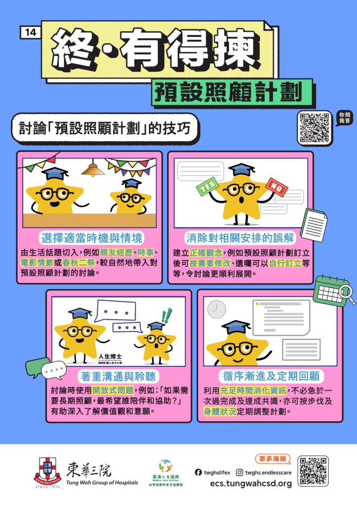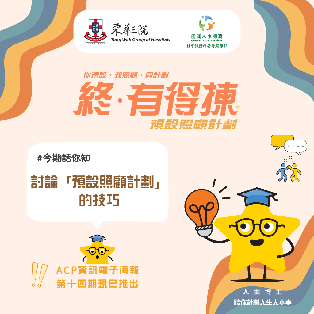 為增加大家對「預設照顧計劃」(Advance Care Planning)的認識,計劃將會定時每月發放提供一系列「預設照顧計劃」電子海報,讓大家獲取與晚期照顧安排相關的資訊,並鼓勵大家將資訊與相關人士分享。