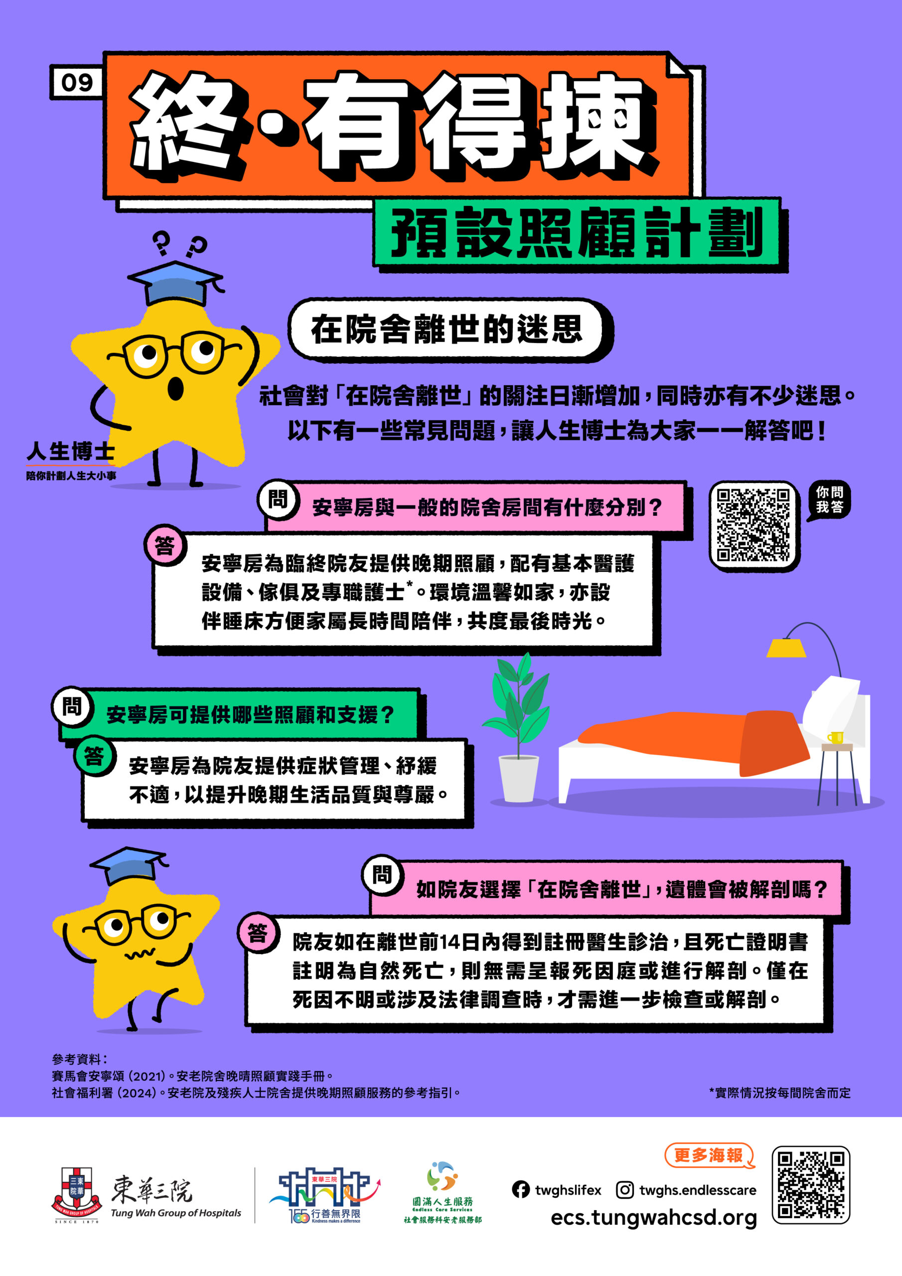 閱讀資訊後如有疑問,歡迎登入網上表格【知多啲啲 你問我答】,填妥簡單的電子表格,「圓滿人生服務」將會透過電郵/簡單 WhatsApp 回答閣下有關預設照顧計劃 (ACP) 或居處離世的疑問。如欲持續訂閱【終.有得揀】預設照顧計劃電子海報,請按此。
