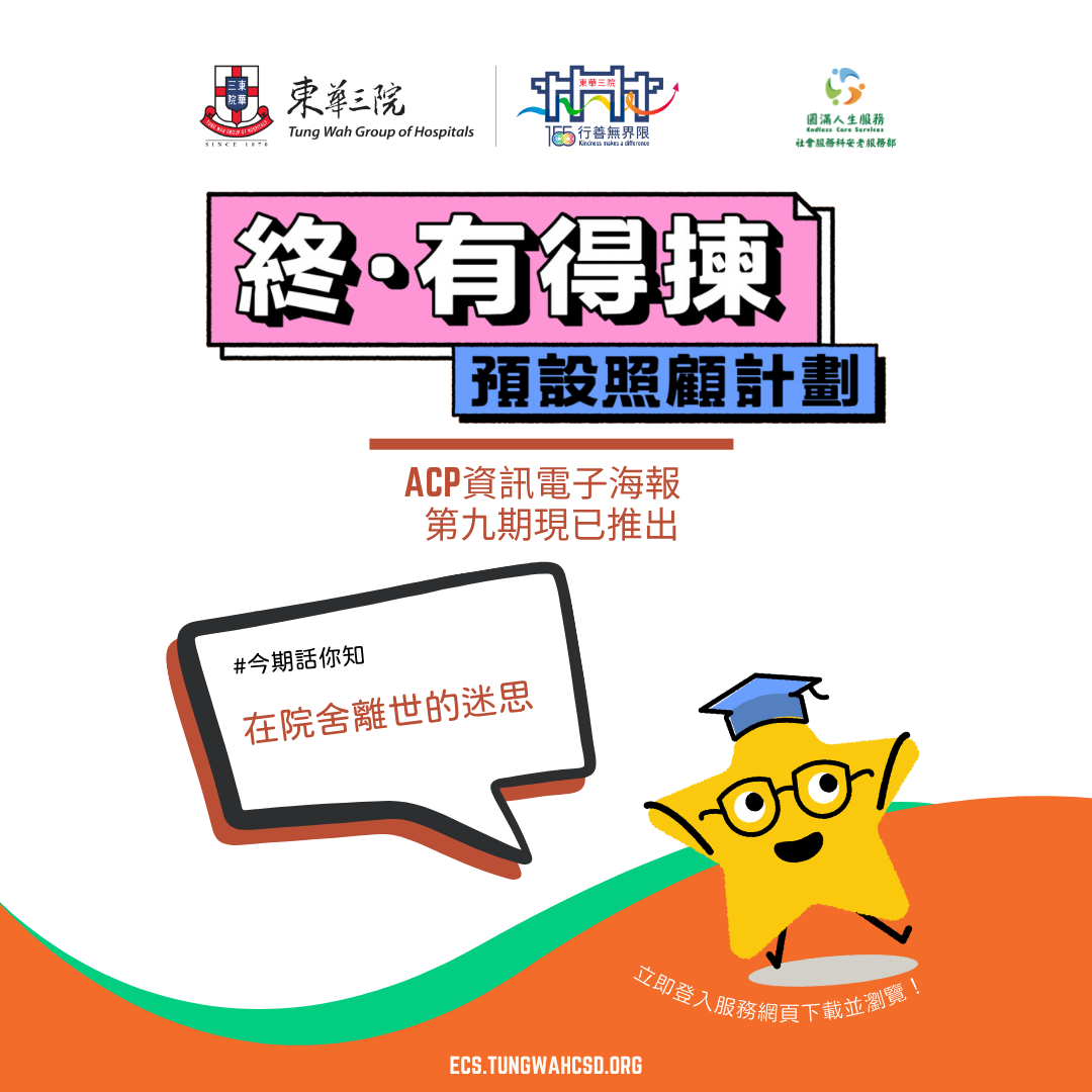 為增加大家對「預設照顧計劃」(Advance Care Planning)的認識,計劃將會定時每月發放提供一系列「預設照顧計劃」電子海報,讓大家獲取與晚期照顧安排相關的資訊,並鼓勵大家將資訊與相關人士分享。